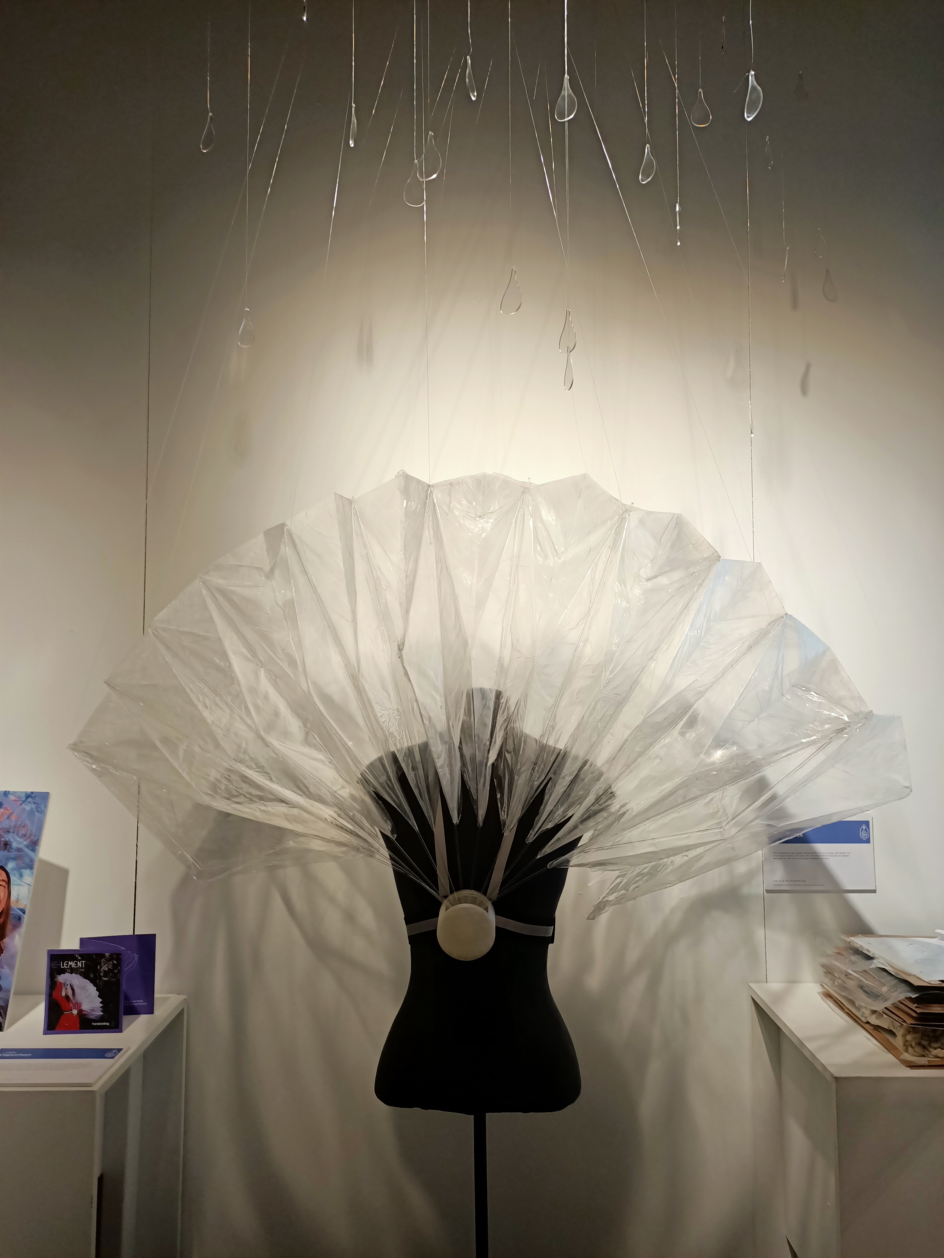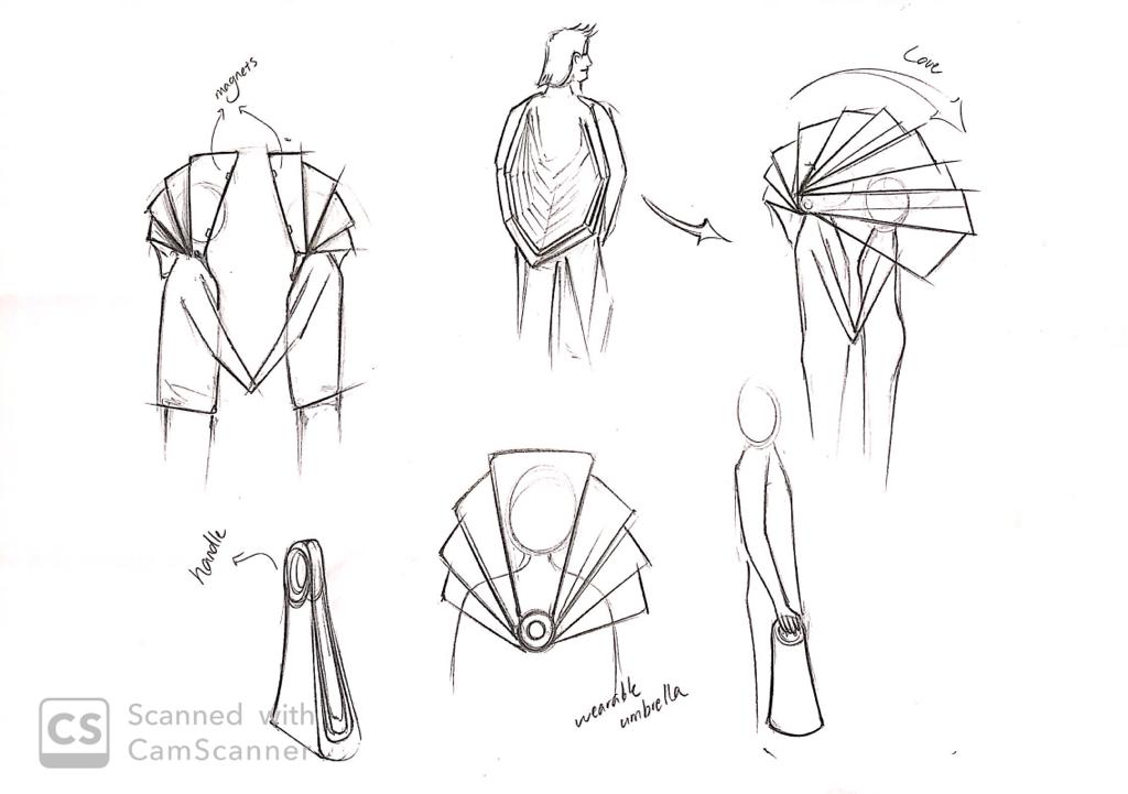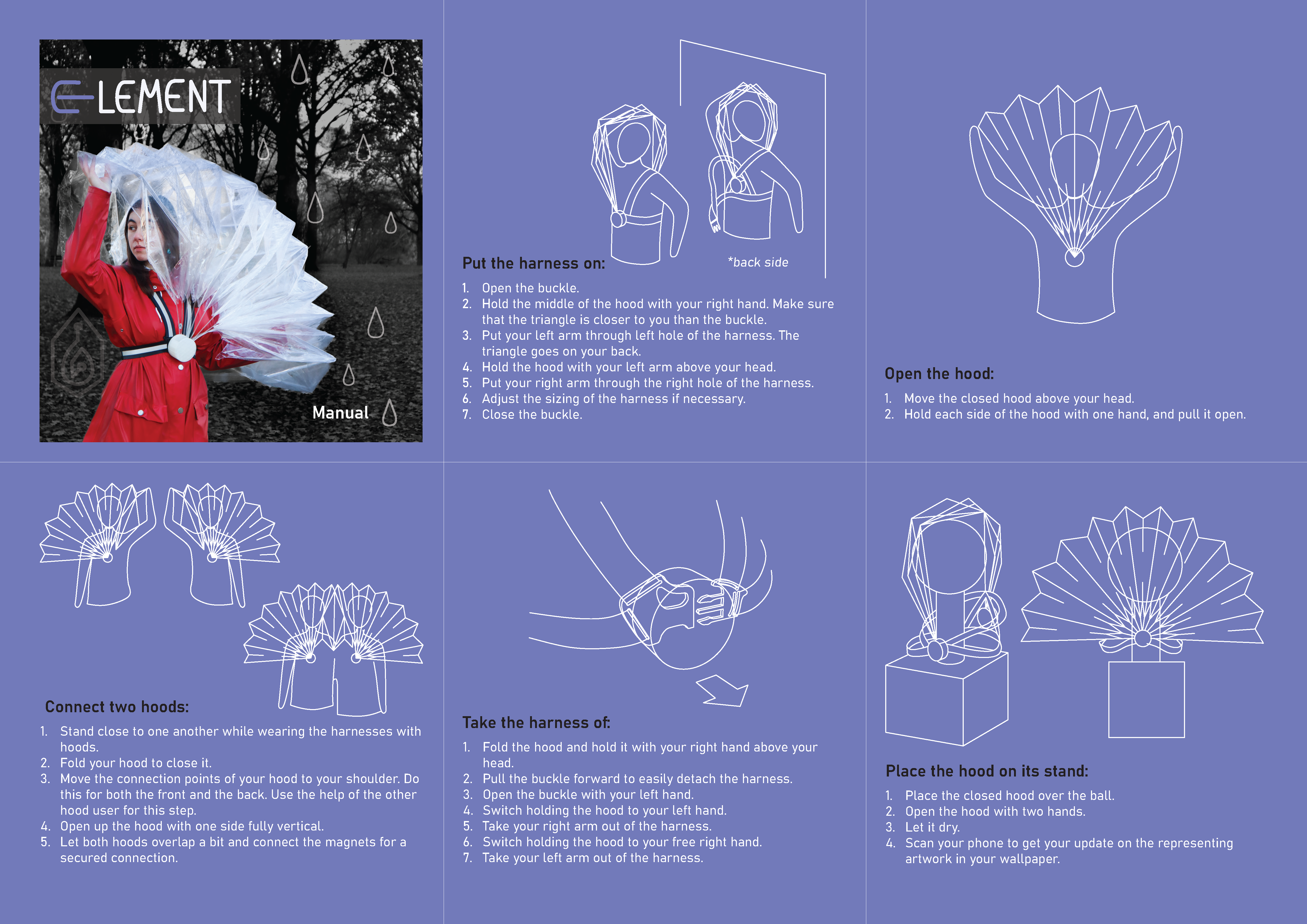 Element is a transparent foldable rain hood that can be worn over your clothes. It facilitates social connection by giving you the ability to connect your hood with another person and walk underneath one big hood. Element uses electronics to transform the gloomy weather into colourful art. When you walk in the rain the hood will detect the raindrops which will generate a painting-like visual. When you connect the hood with someone else you will receive the personal colour of their hood, which will then be added to your artwork. Once you are home, you can place your hood on the holder and scan your phone to receive your artwork. In this way, you can see through the colours if you haven’t met your friends in a while.