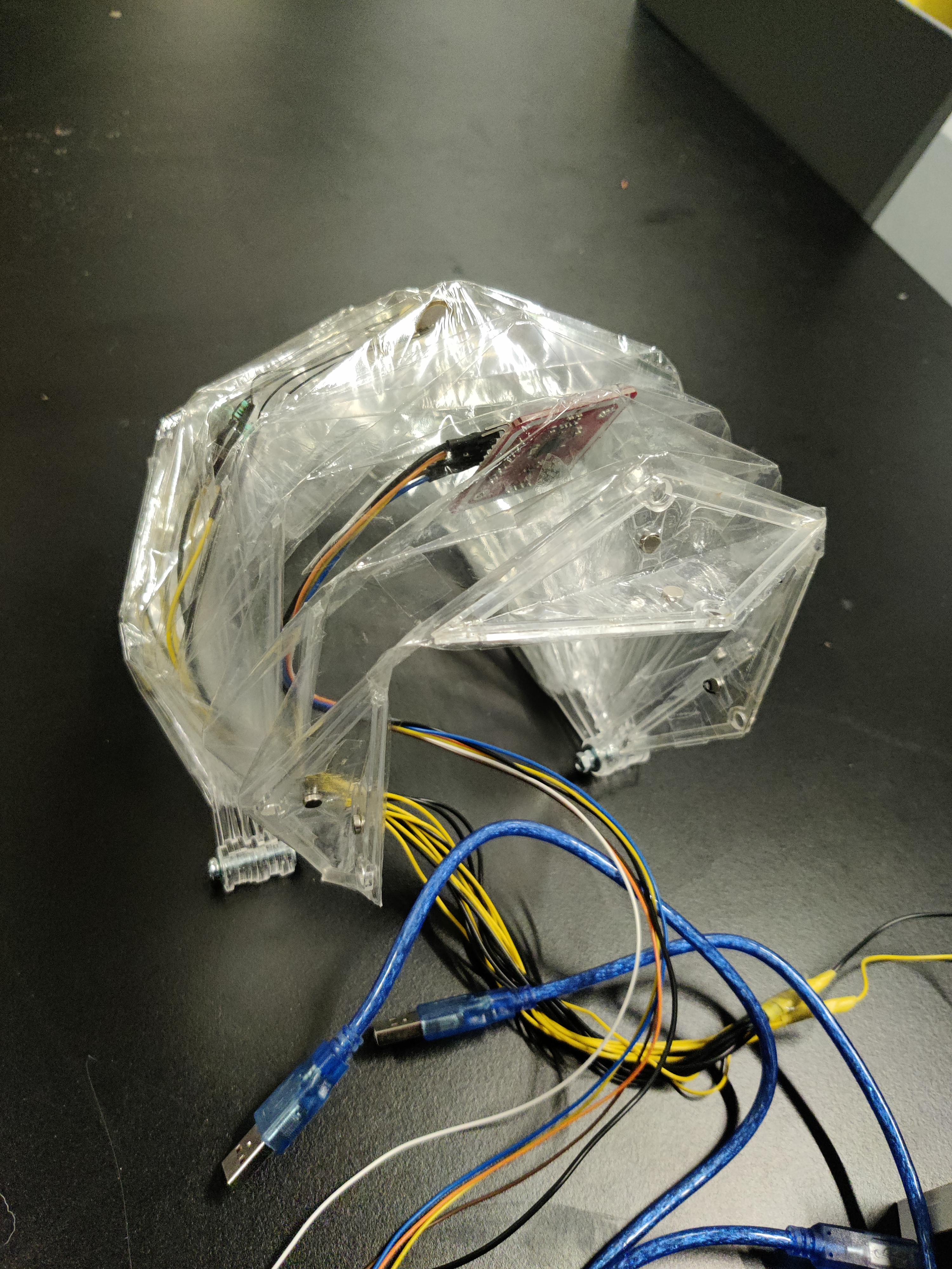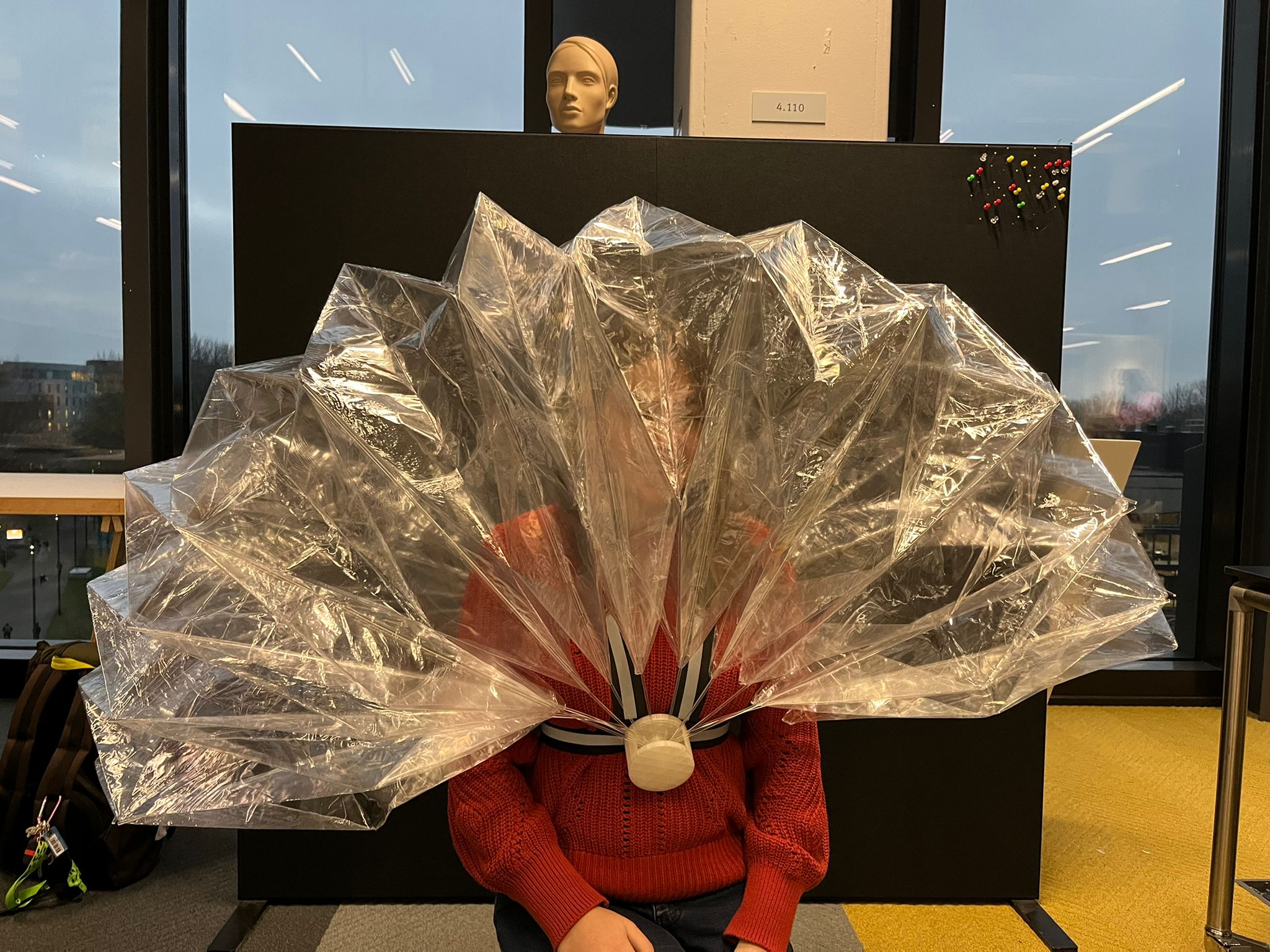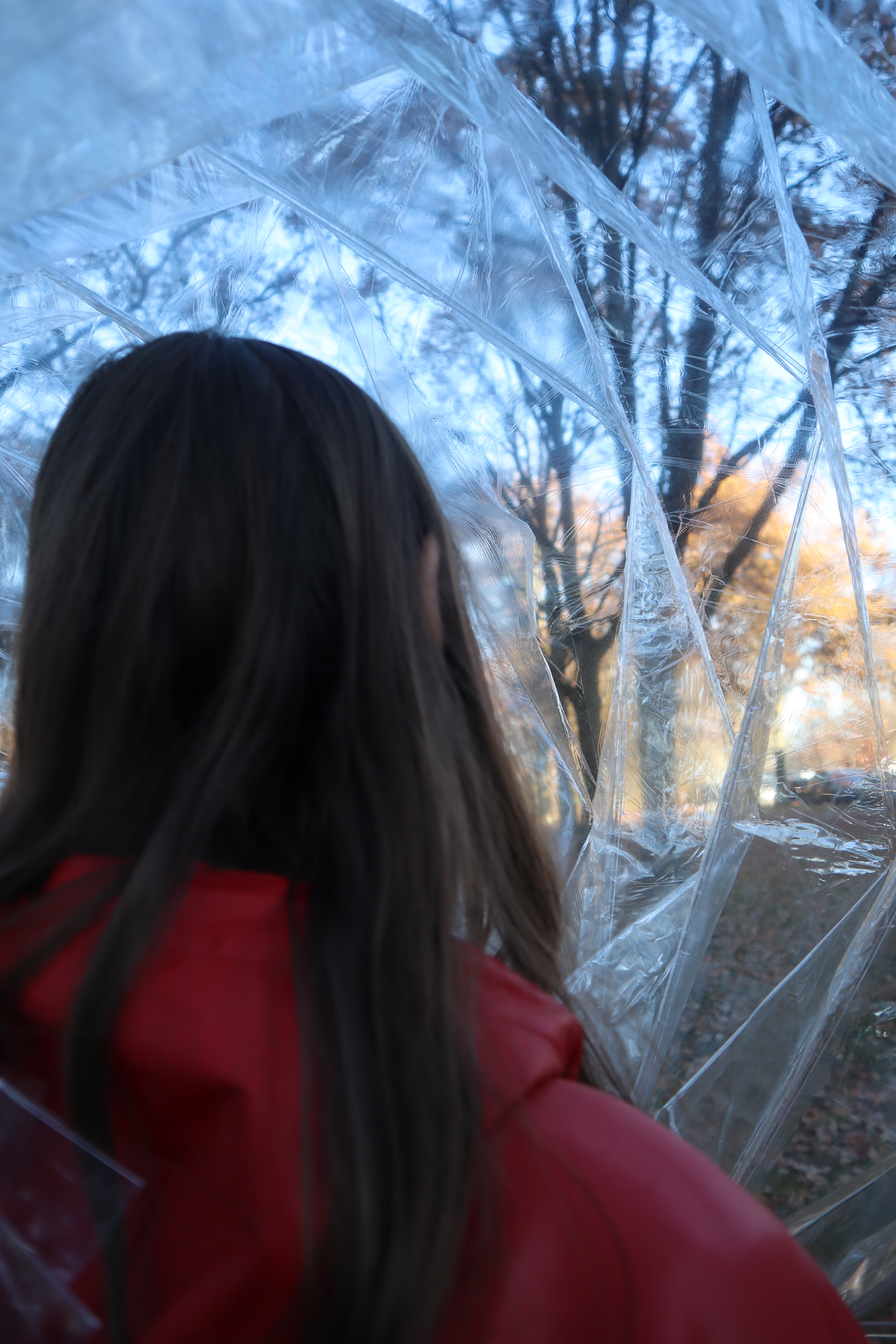 Element is a transparent foldable rain hood that can be worn over your clothes. It facilitates social connection by giving you the ability to connect your hood with another person and walk underneath one big hood. Element uses electronics to transform the gloomy weather into colourful art. When you walk in the rain the hood will detect the raindrops which will generate a painting-like visual. When you connect the hood with someone else you will receive the personal colour of their hood, which will then be added to your artwork. Once you are home, you can place your hood on the holder and scan your phone to receive your artwork. In this way, you can see through the colours if you haven’t met your friends in a while.