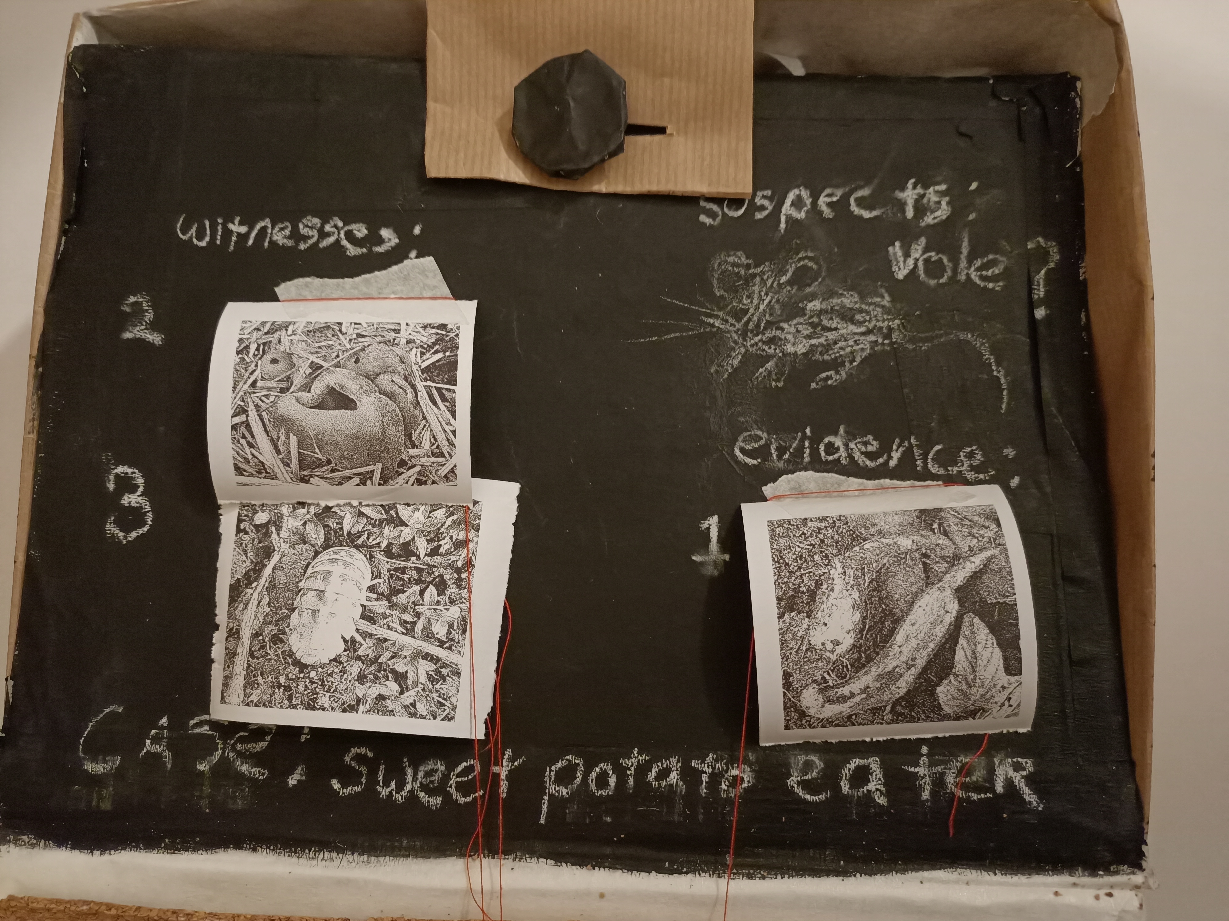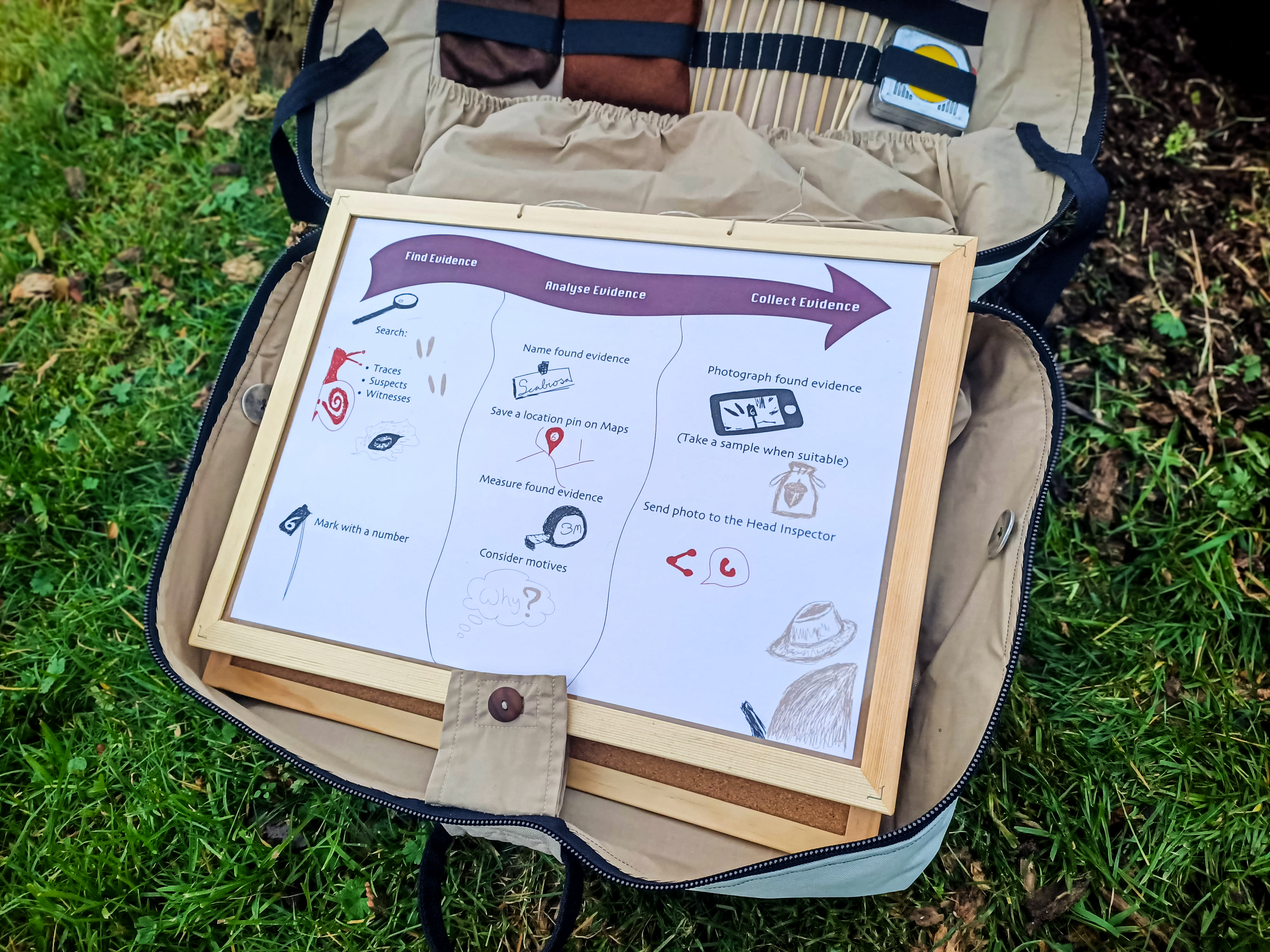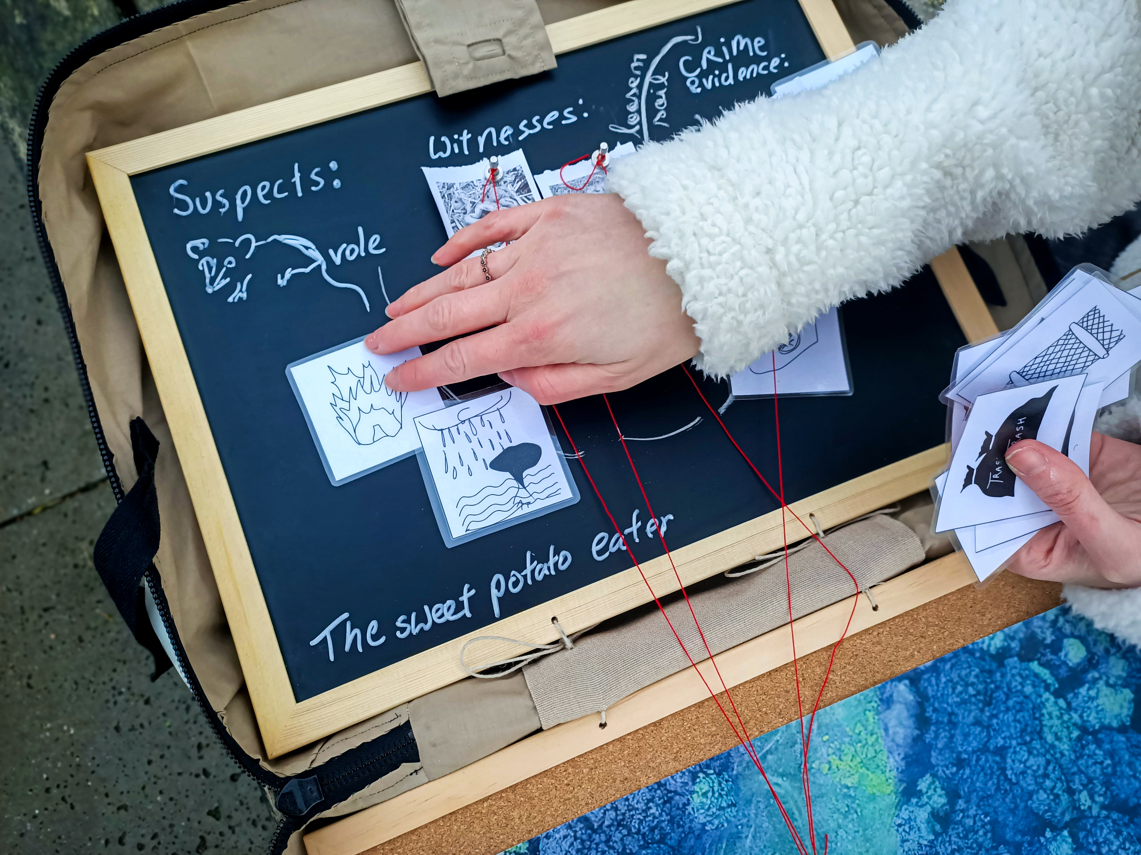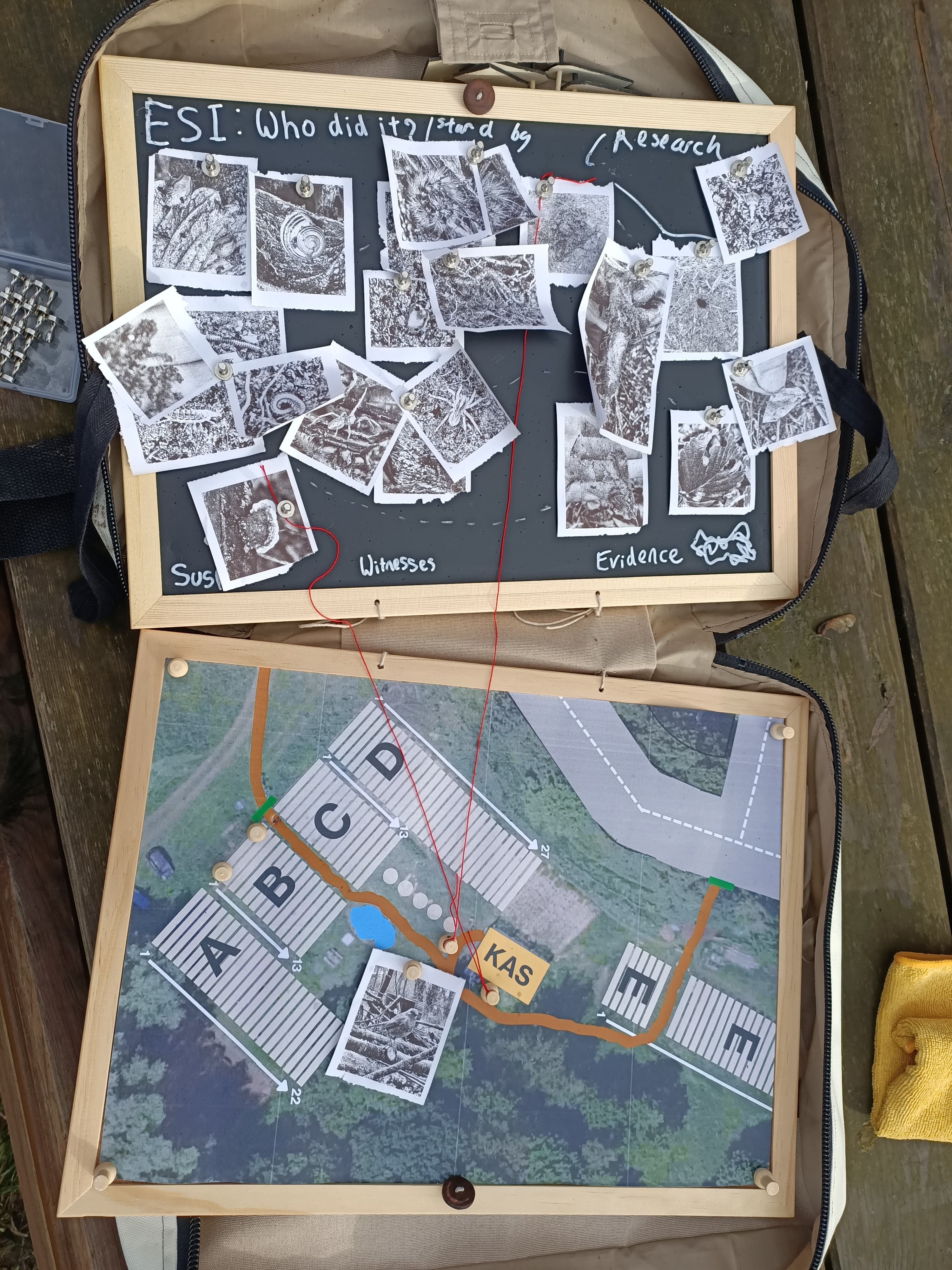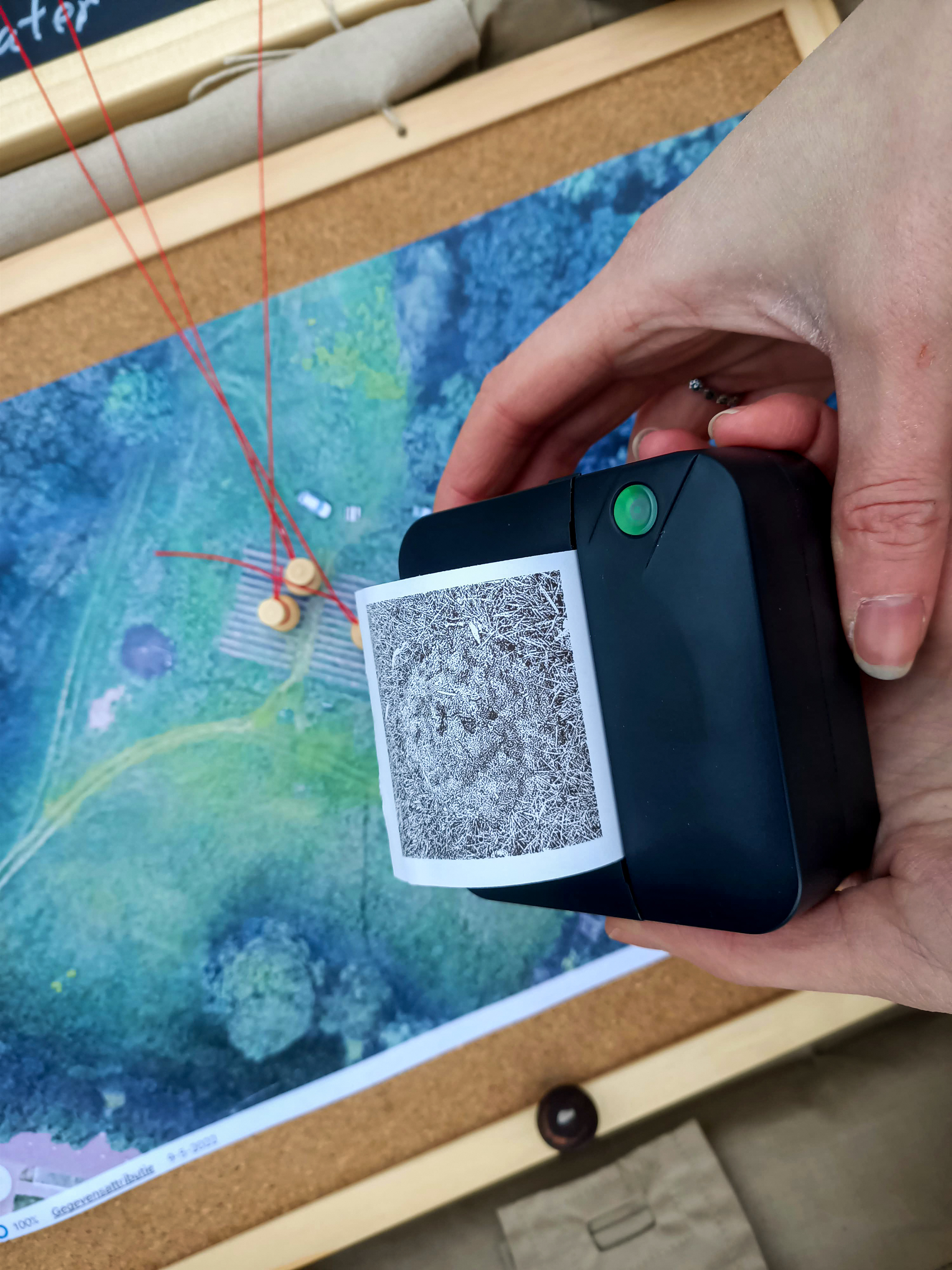 While the group takes a break, the Chief Inspector prints the photos with a thermal printer. Participants then place their photos one by one on a board, provide a description, and match the photo to the correct location on the map. They categorize the trace as, for example, suspect, witness, or evidence.