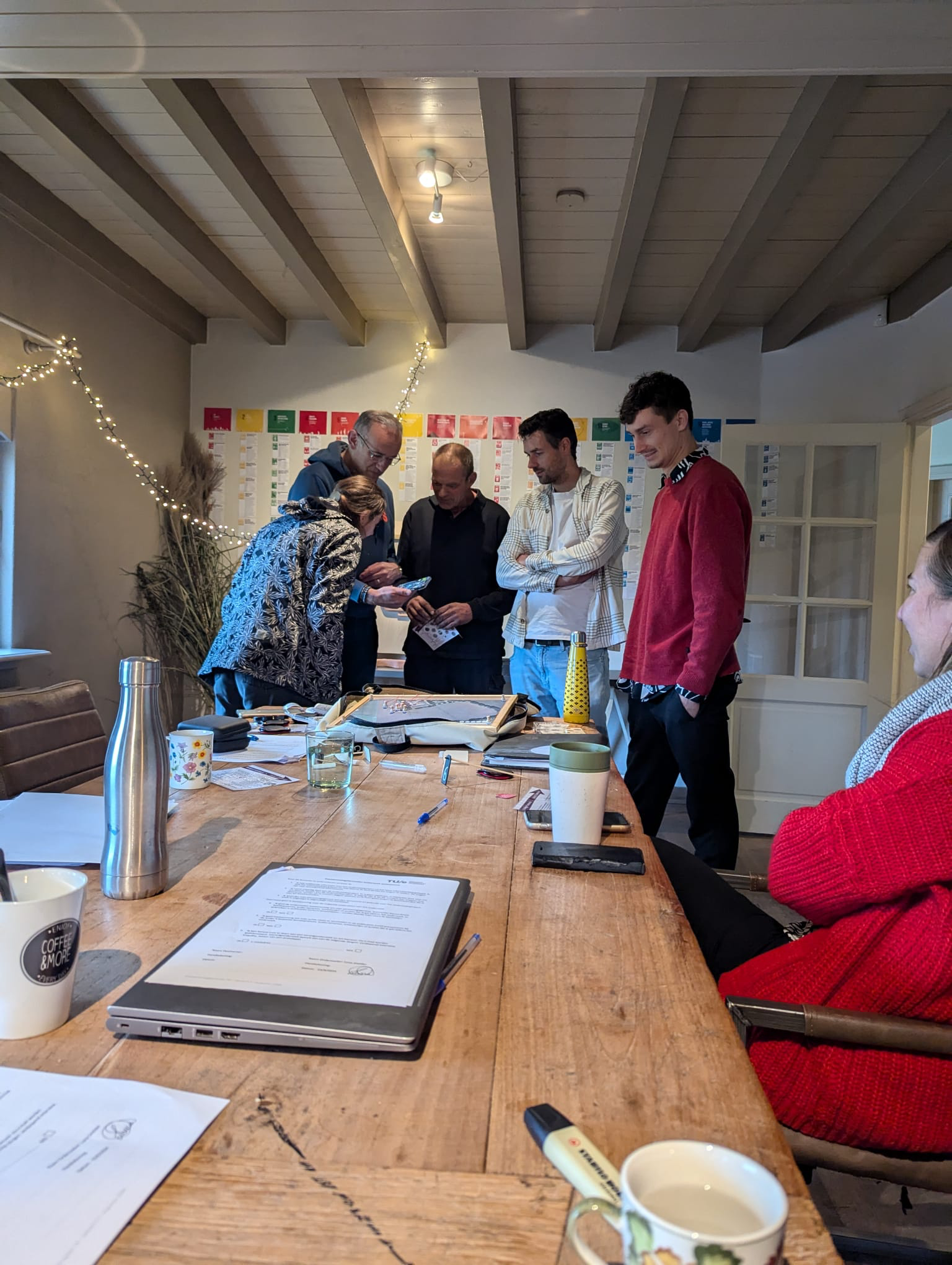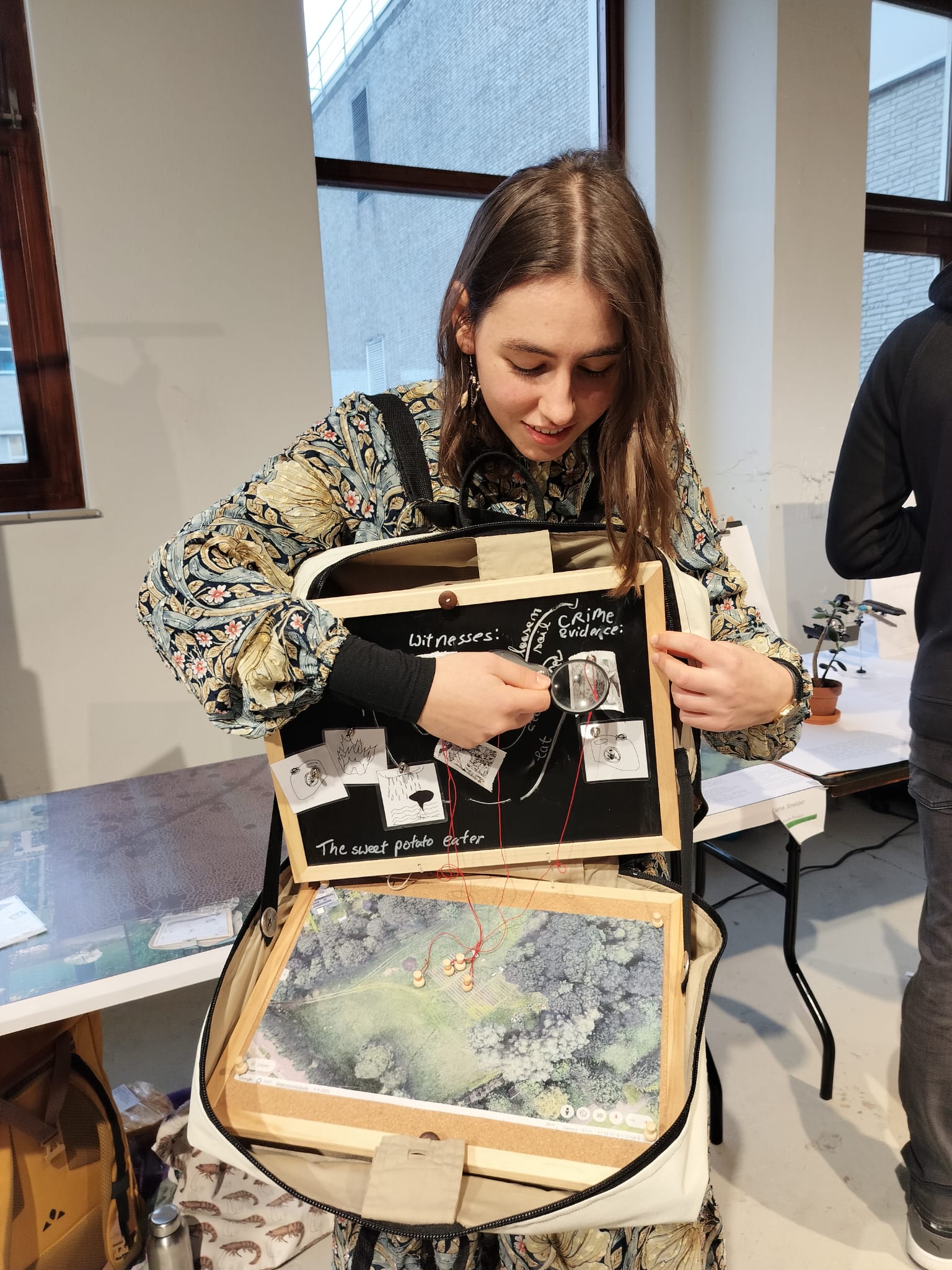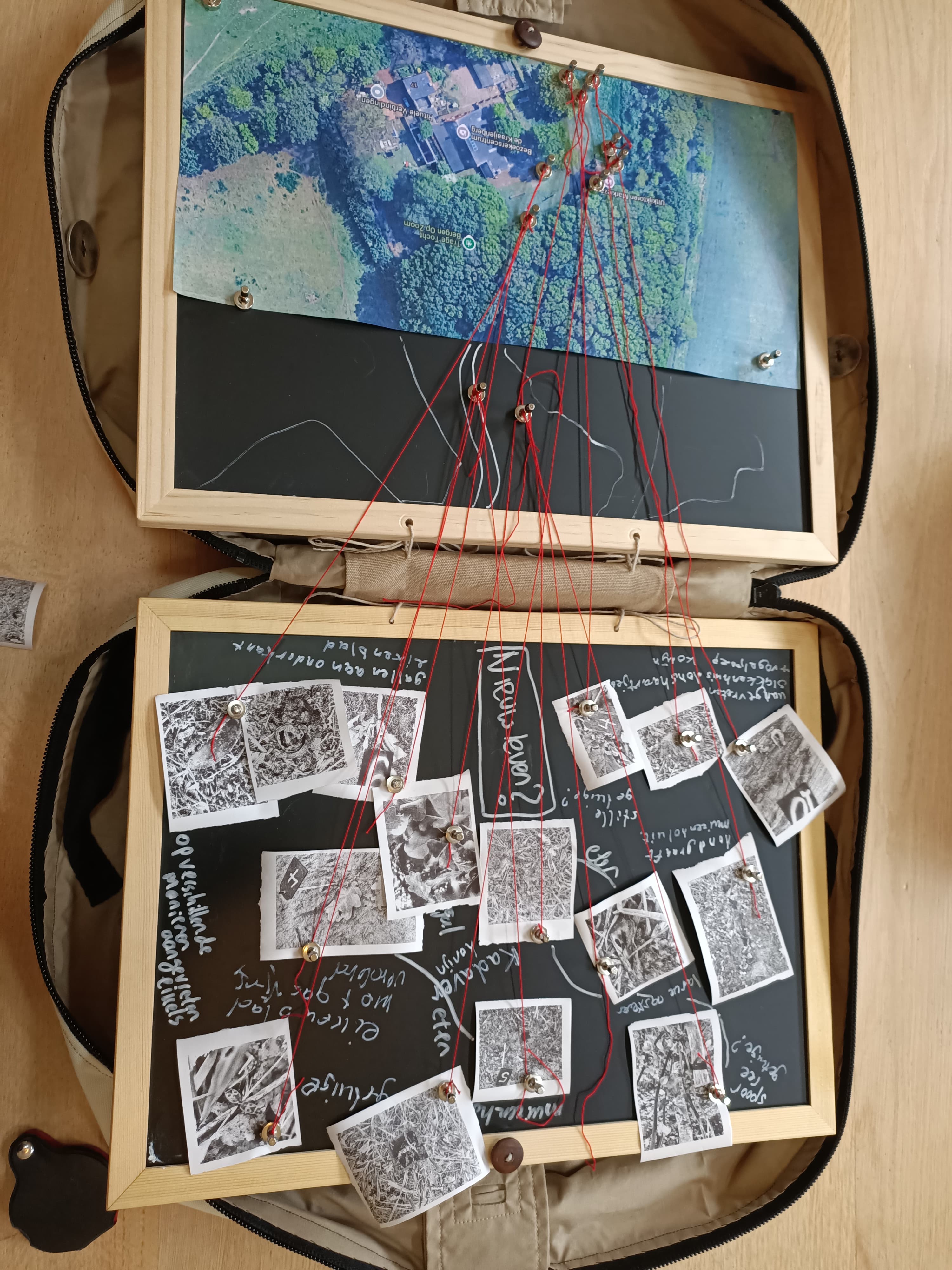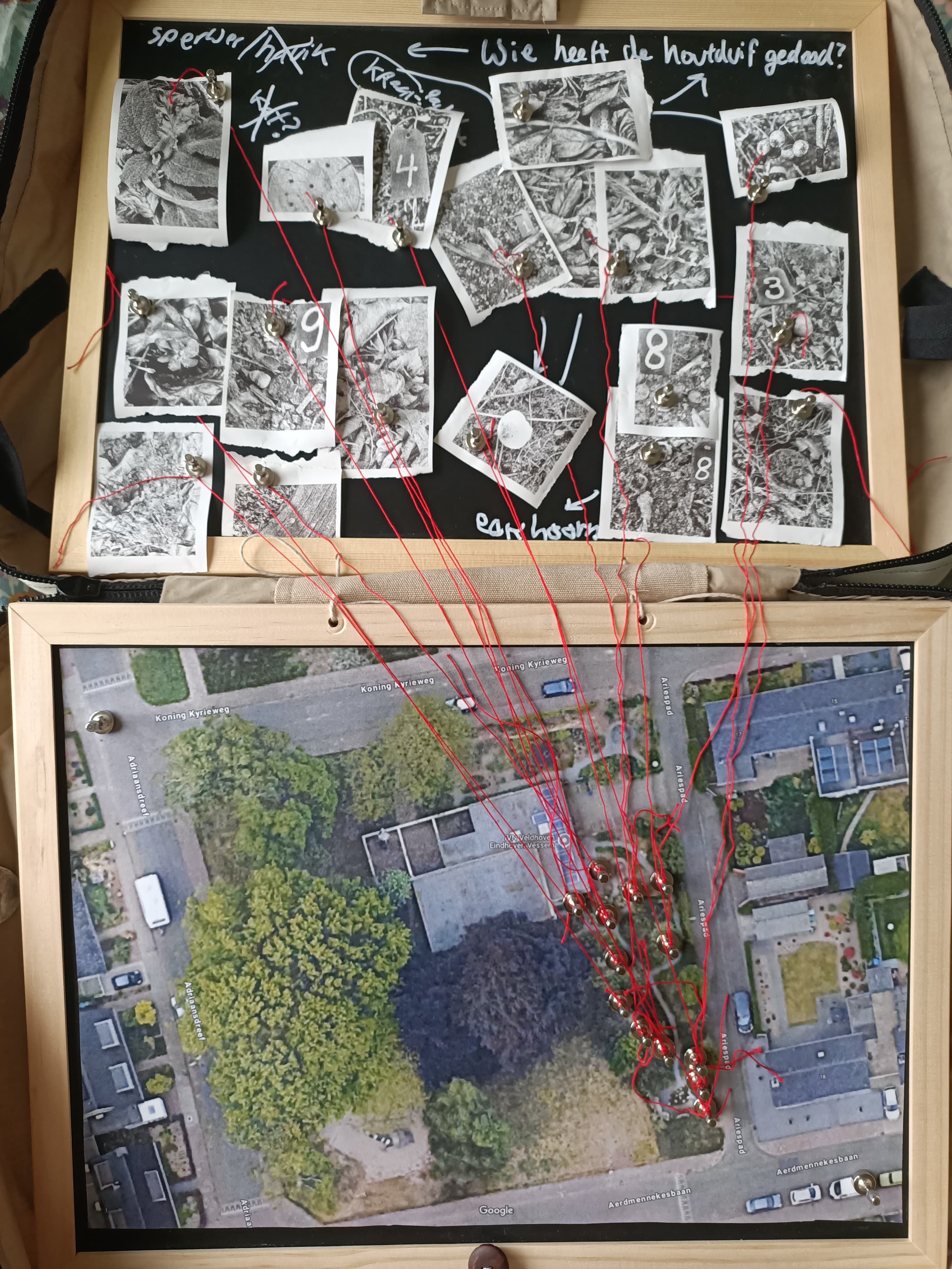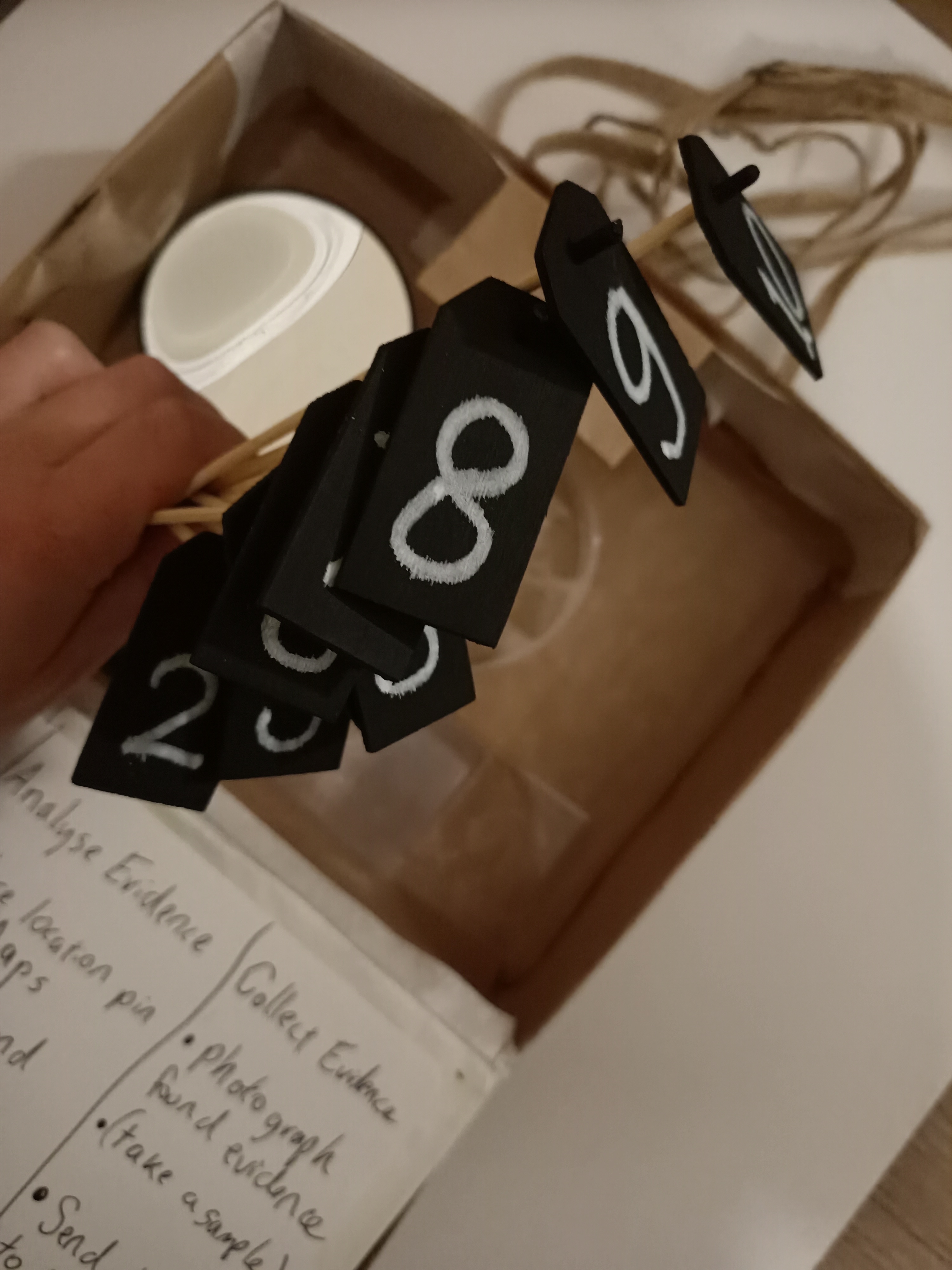 While the group takes a break, the Chief Inspector prints the photos with a thermal printer. Participants then place their photos one by one on a board, provide a description, and match the photo to the correct location on the map. They categorize the trace as, for example, suspect, witness, or evidence.